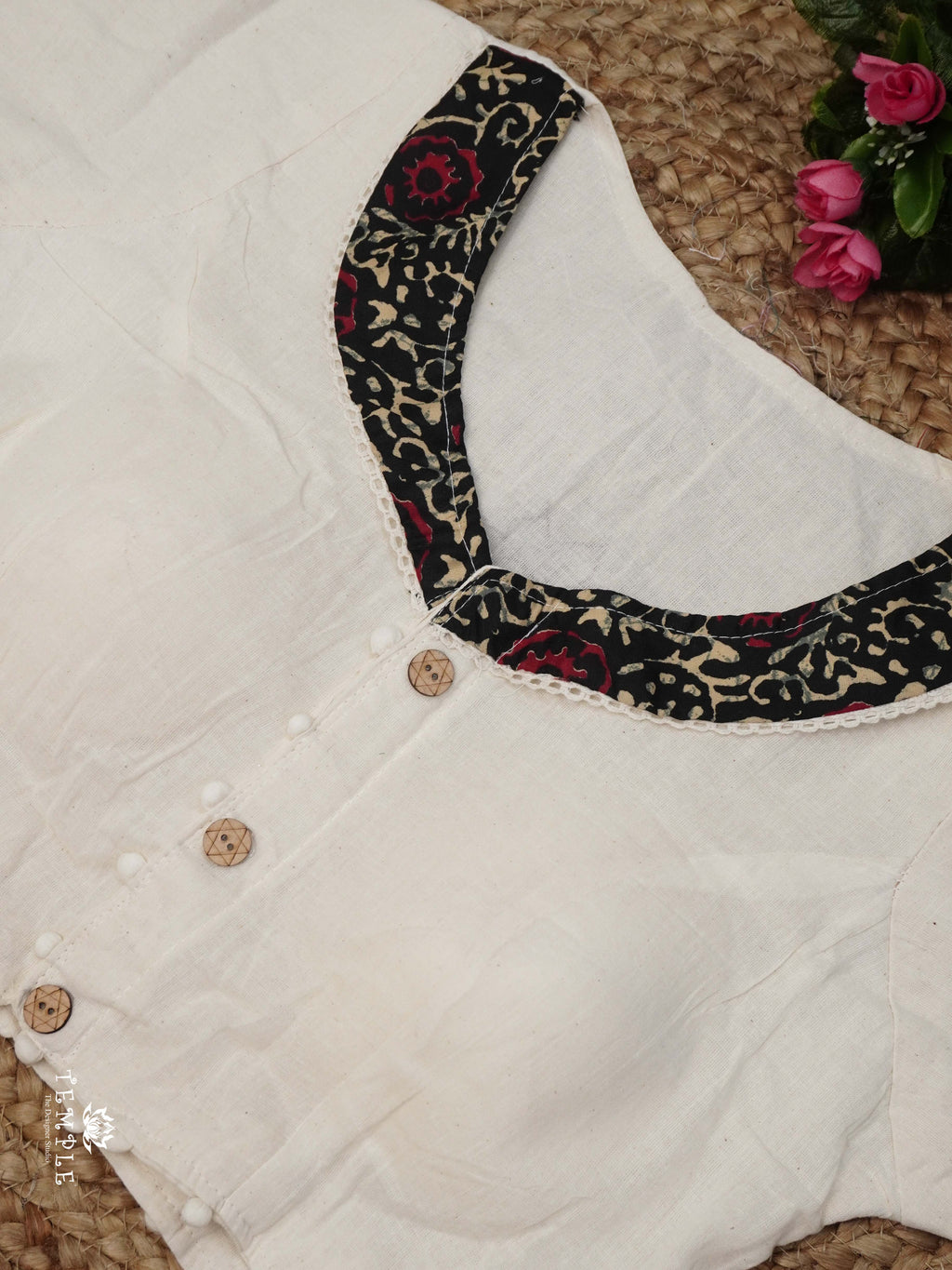 This is a U-neck blouse featuring a front-open pattern with wooden button closure.The blouse has elbow-length sleeves. The waistline is finished with tiny fabric pom-pom edging, offering a subtle decorative detail. The fit is structured, with defined bust cups for better shaping, making it ideal for pairing with handloom or traditional sarees.
