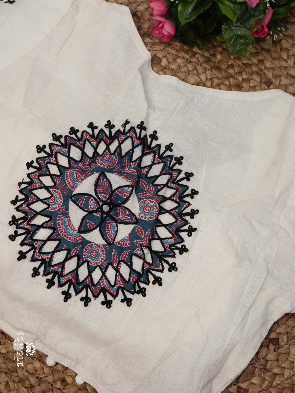 This is a U-neck blouse featuring a front-open pattern with wooden button closure.The blouse has elbow-length sleeves. The waistline is finished with tiny fabric pom-pom edging, offering a subtle decorative detail. The fit is structured, with defined bust cups for better shaping, making it ideal for pairing with handloom or traditional sarees.