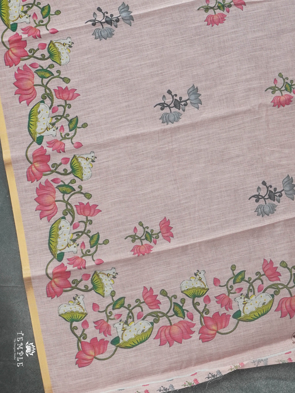 Work - Light Weight and easy to wear Chanderi Cotton Saree. Adorned with Pichwai Patterns all over the body. Attached With Printed Blouse.