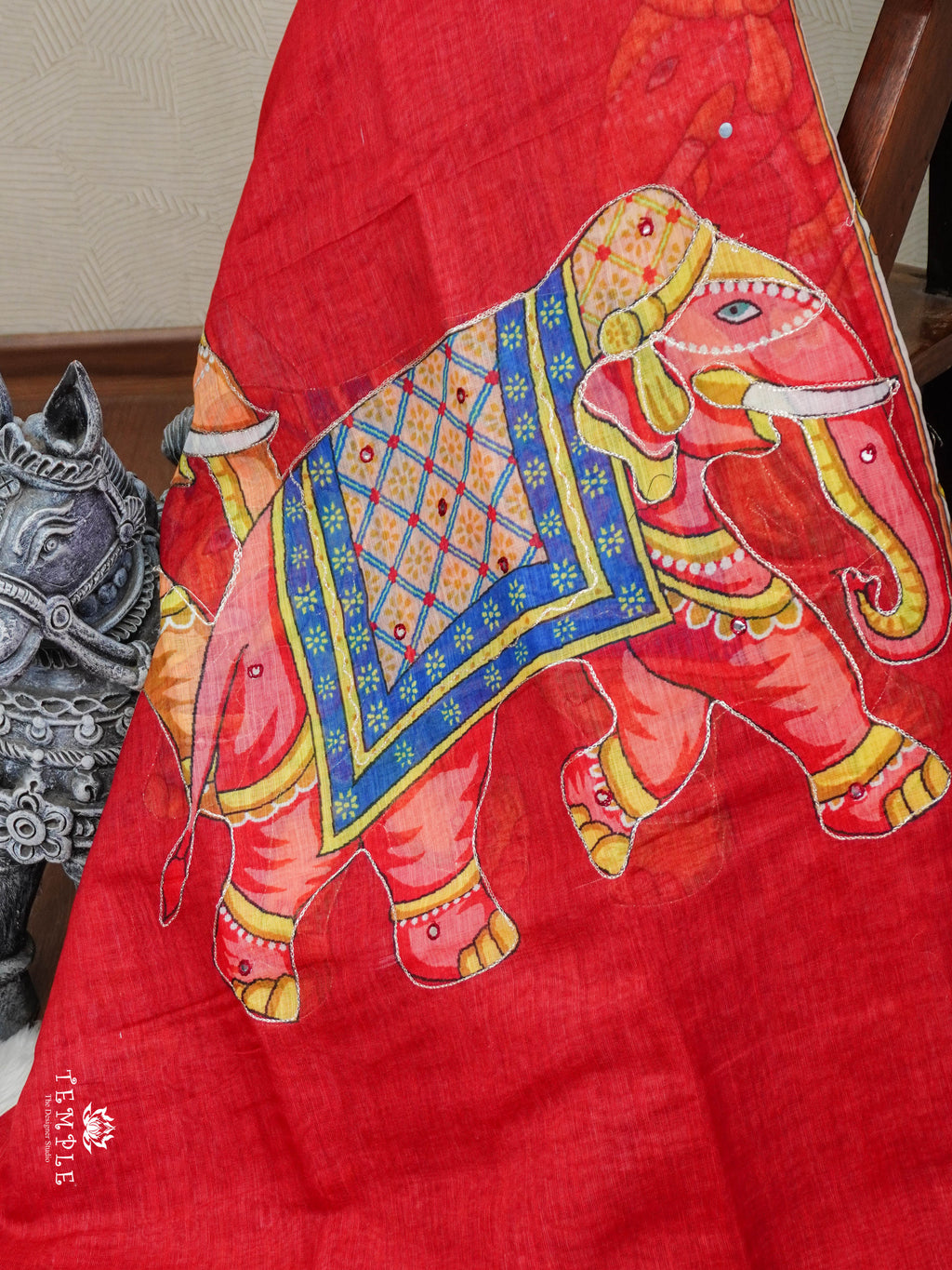Work - Light Weight and easy to wear Linen Cotton Saree. Adorned with Elephant Patterns all over the body. Attached With Contrast Blouse.