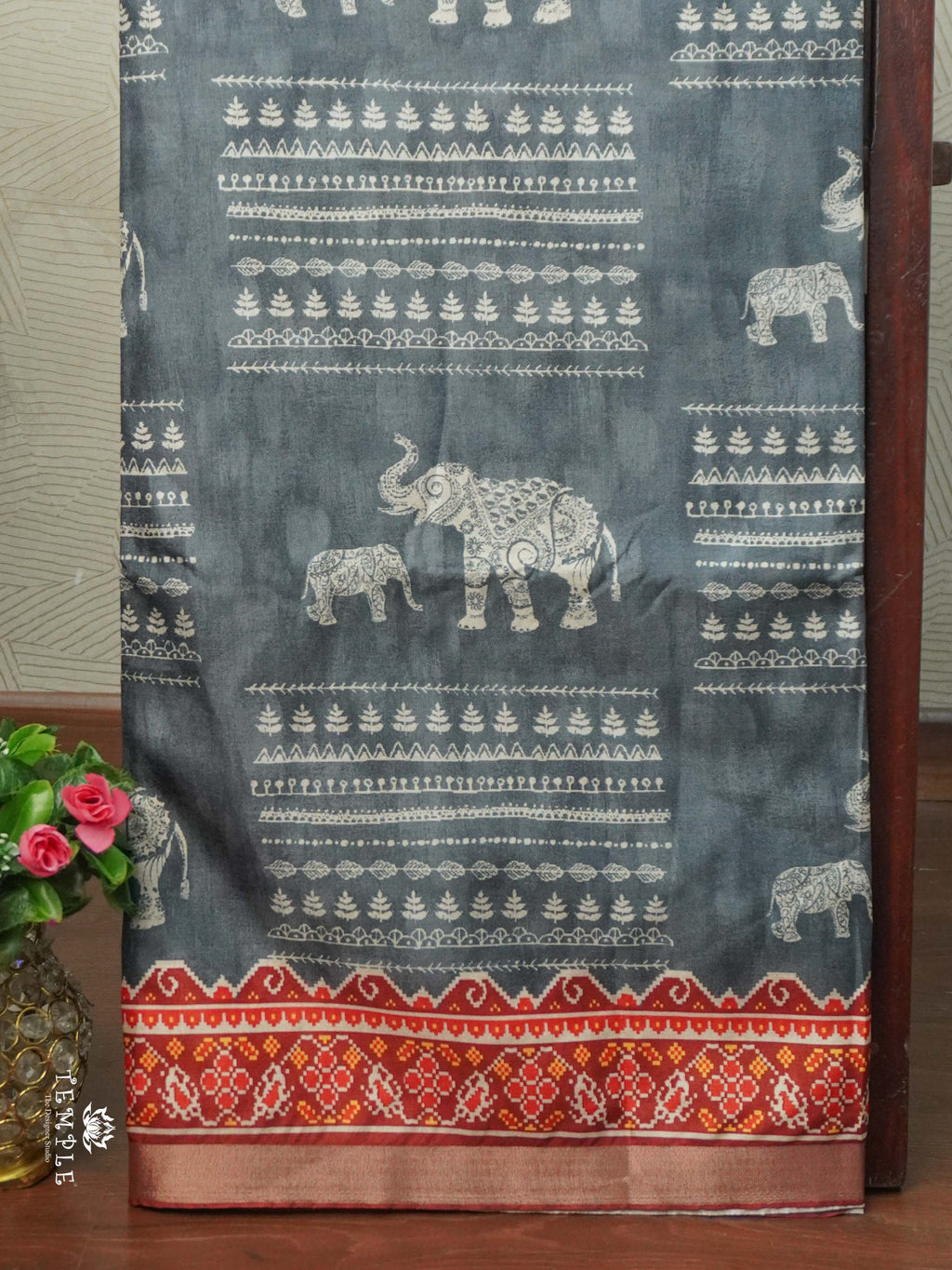 Work - Attractive Fancy Cotton Saree. Fancy Elephant Design and ikat-style floral design. Paired with printed blouse.