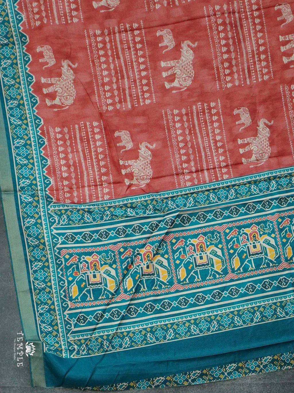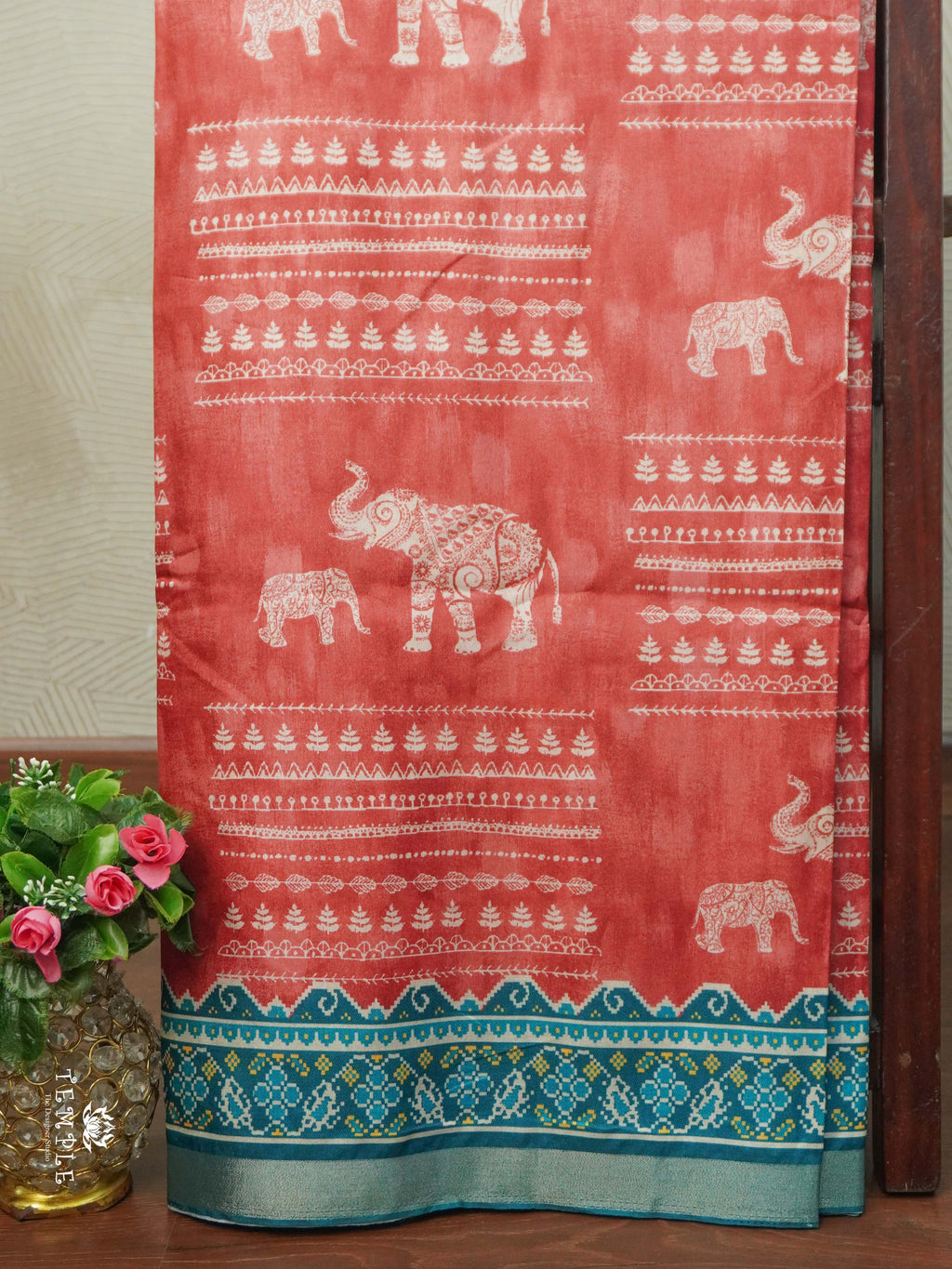 Work - Attractive Fancy Cotton Saree. Fancy Elephant Design and ikat-style floral design. Paired with printed blouse.