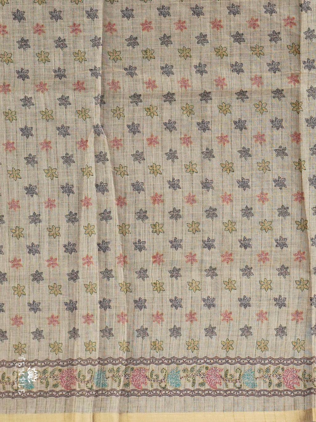 Work - This Linen cotton saree features Geometrical Pattern all over the body, inspired by traditional folk art. Attached with Printed Blouse.
