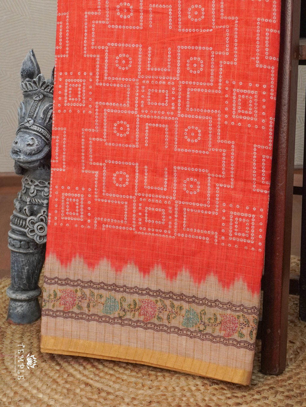 Work - This Linen cotton saree features Geometrical Pattern all over the body, inspired by traditional folk art. Attached with Printed Blouse.