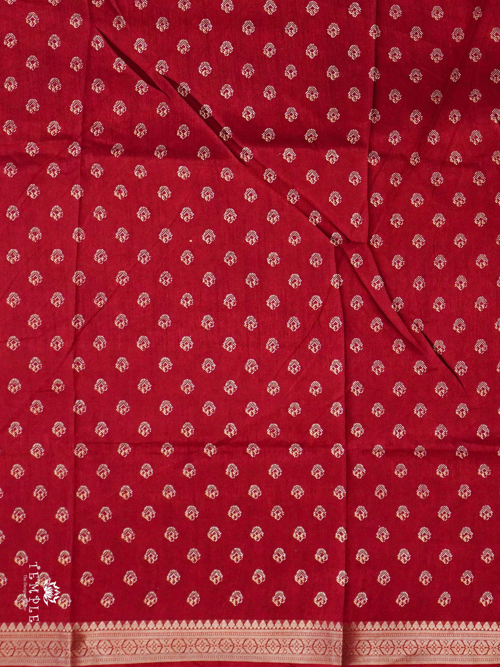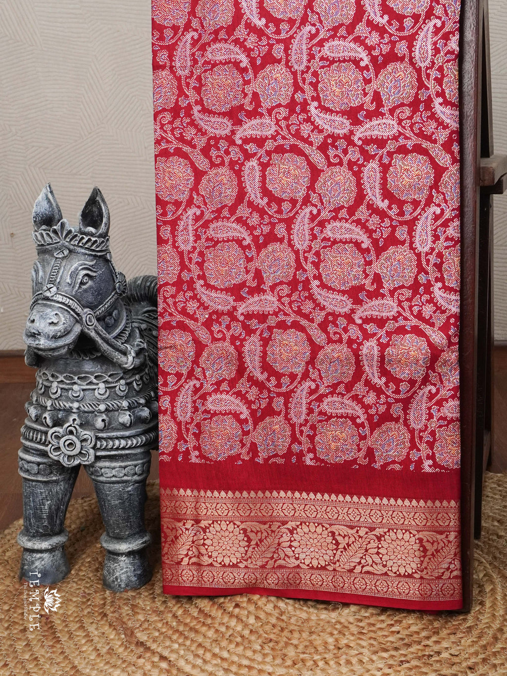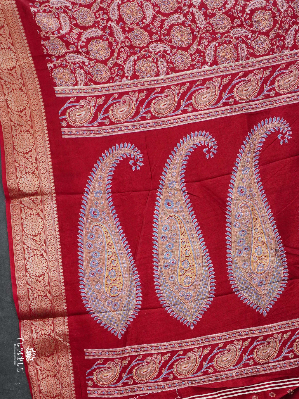 Work - Adorned with finely detailed paisley and floral butta motifs, woven in harmonious shades of red, antique gold, and soft beige, creating a regal all-over pattern.
