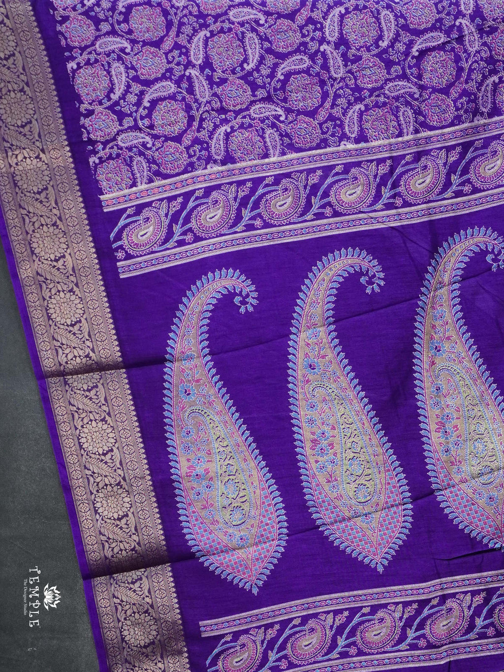 Work - Adorned with finely detailed paisley and floral butta motifs, woven in harmonious shades of red, antique gold, and soft beige, creating a regal all-over pattern.