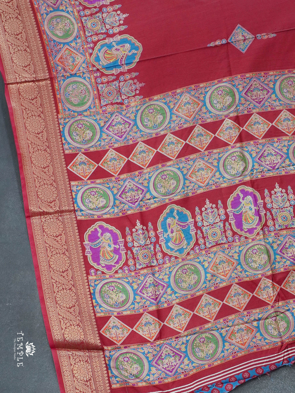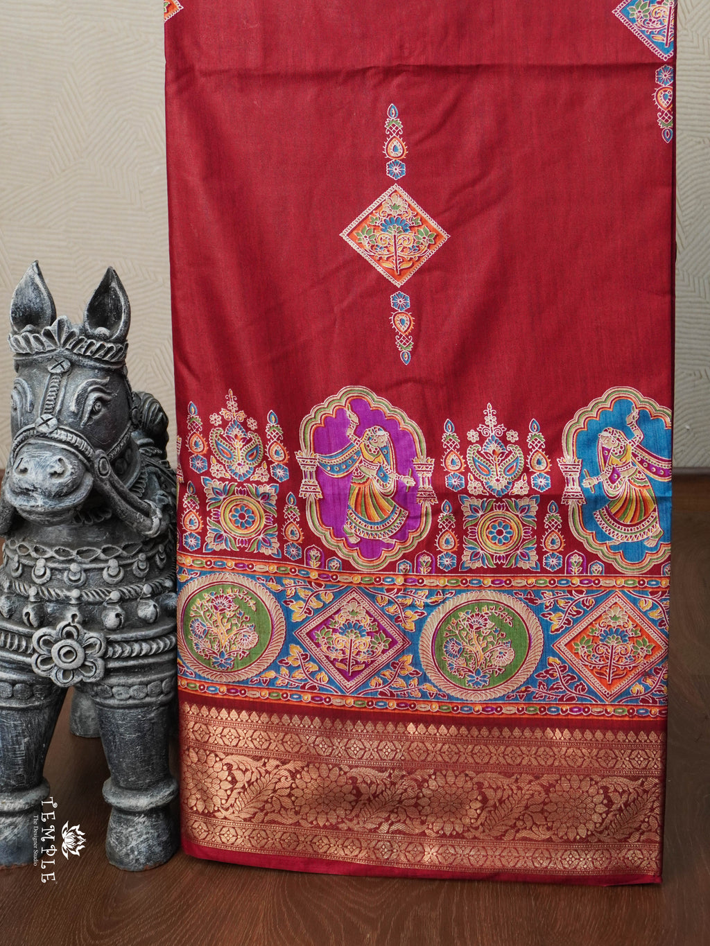 Work - Light Weight and easy to wear Dola Silk Saree. Adorned with beautiful prints all over the body. Attached With Printed Blouse.