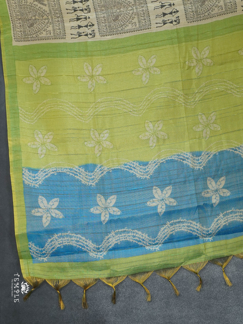 Work - This exquisite printed tissue saree showcases a beautiful blend of traditional artistry and contemporary elegance. The saree is adorned with intricate tribal art-inspired prints in classic black, depicting stylized human figures, animals, and ornate patterns, creating a storytelling tapestry on the fabric.