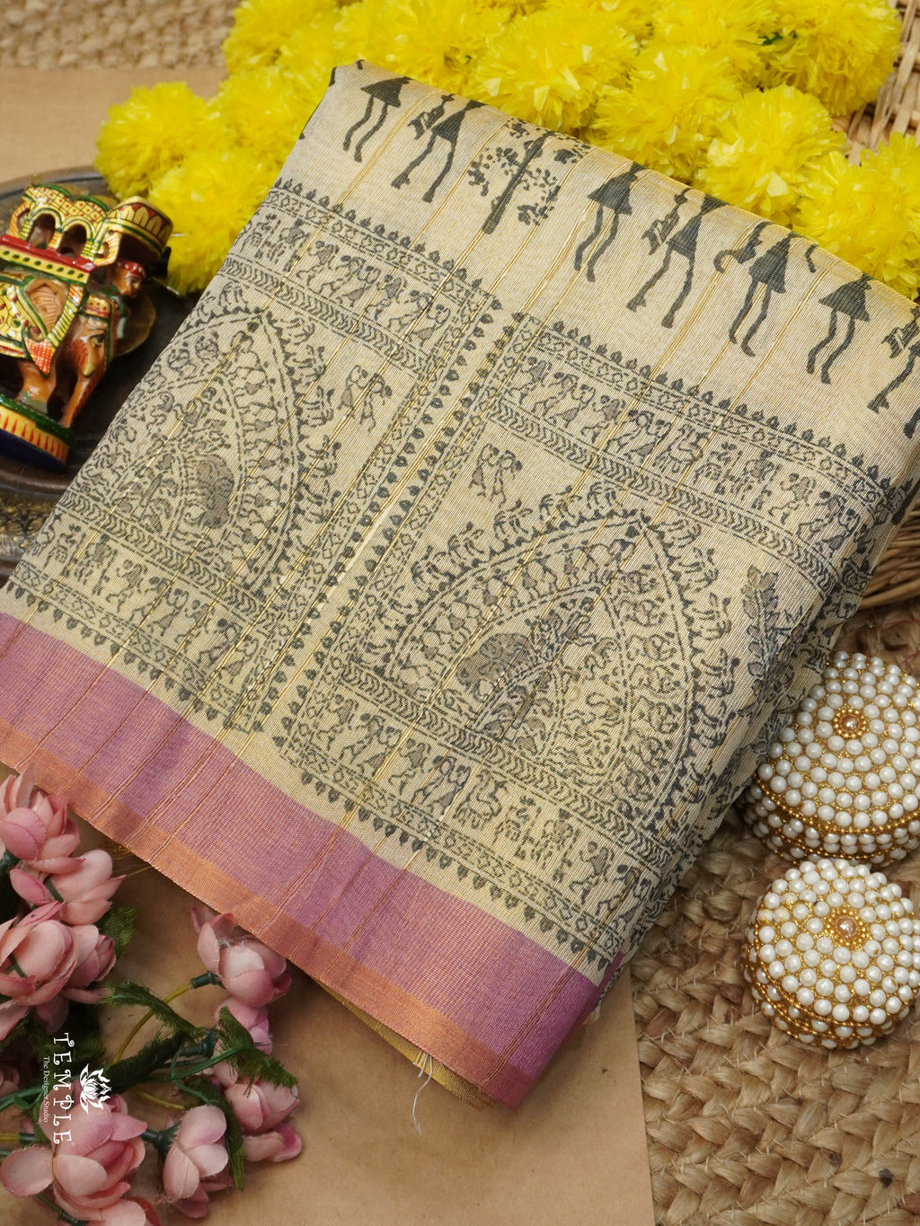 Work - This exquisite printed tissue saree showcases a beautiful blend of traditional artistry and contemporary elegance. The saree is adorned with intricate tribal art-inspired prints in classic black, depicting stylized human figures, animals, and ornate patterns, creating a storytelling tapestry on the fabric.