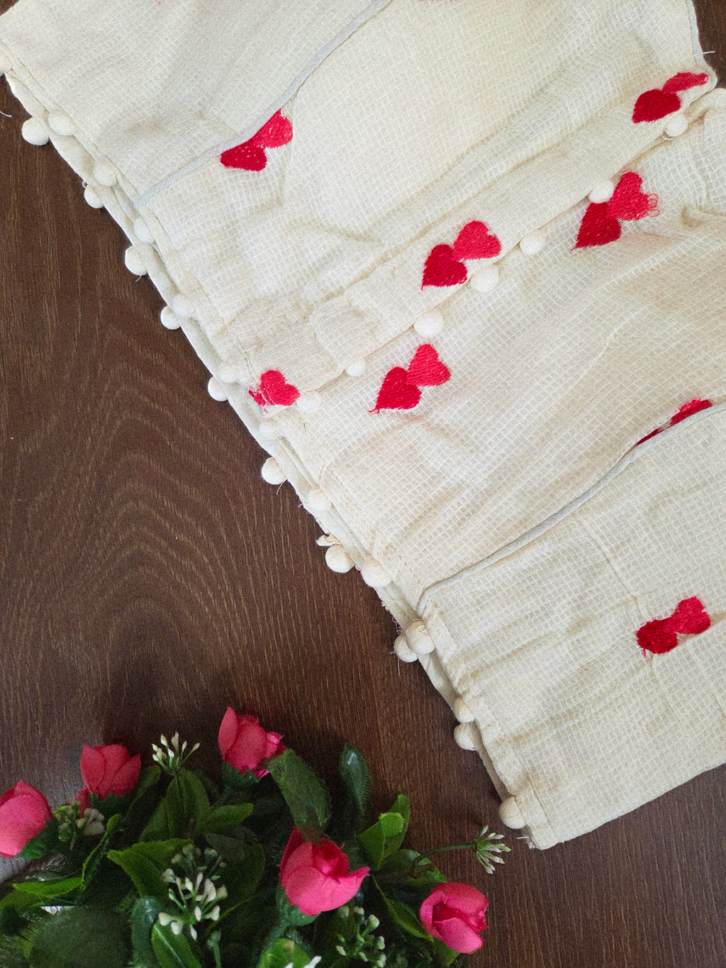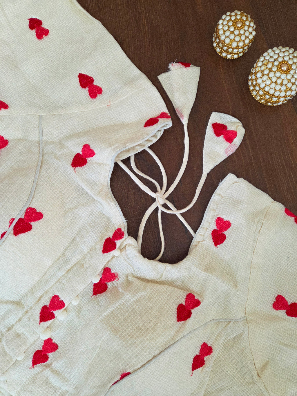 Crafted from premium khadi fabric, this blouse piece features exquisite multi-colour embroidery thread work paired with delicate sequin embellishments for a subtle shimmer. Designed with charming pompom accents and finished with a beautiful latkan detail for an elegant touch.
