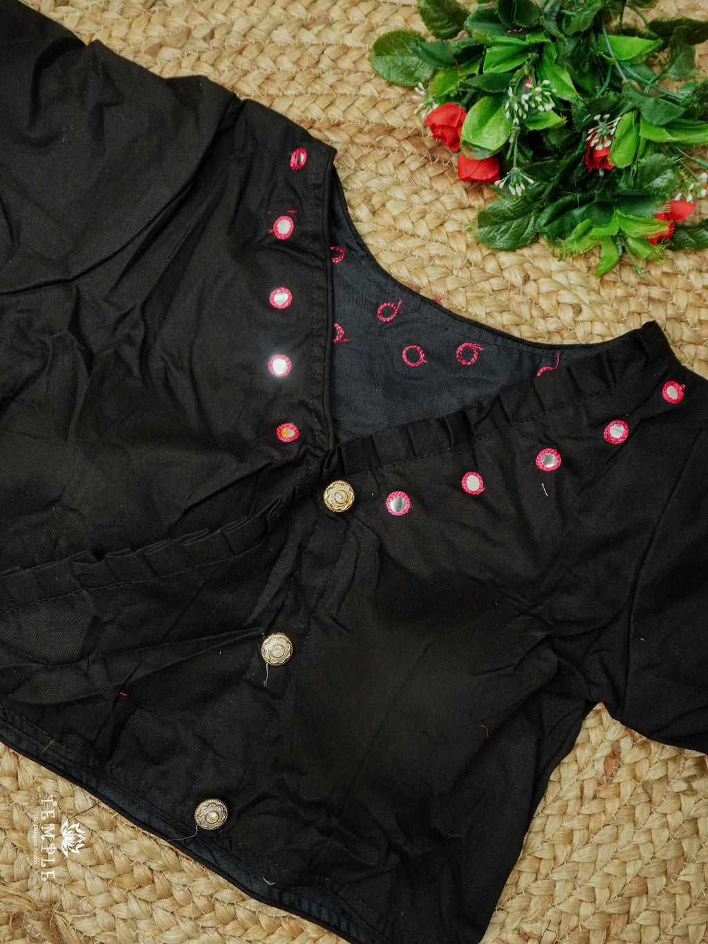 This is a Close neck blouse featuring a front-open pattern with fancy button closure.The blouse has elbow-length sleeves. Offering a subtle decorative detail. The fit is structured, with defined bust cups for better shaping, making it ideal for pairing with handloom or traditional sarees.