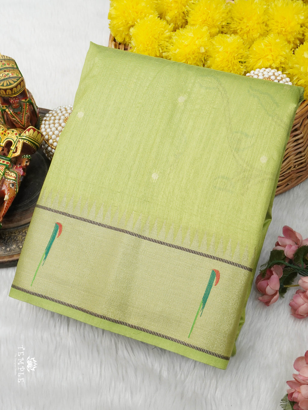Work - Adorned with delicate buttis and a beautifully detailed floral-peacock border in vibrant hues. Elegant, lightweight, and perfect for festive and traditional occasions.
