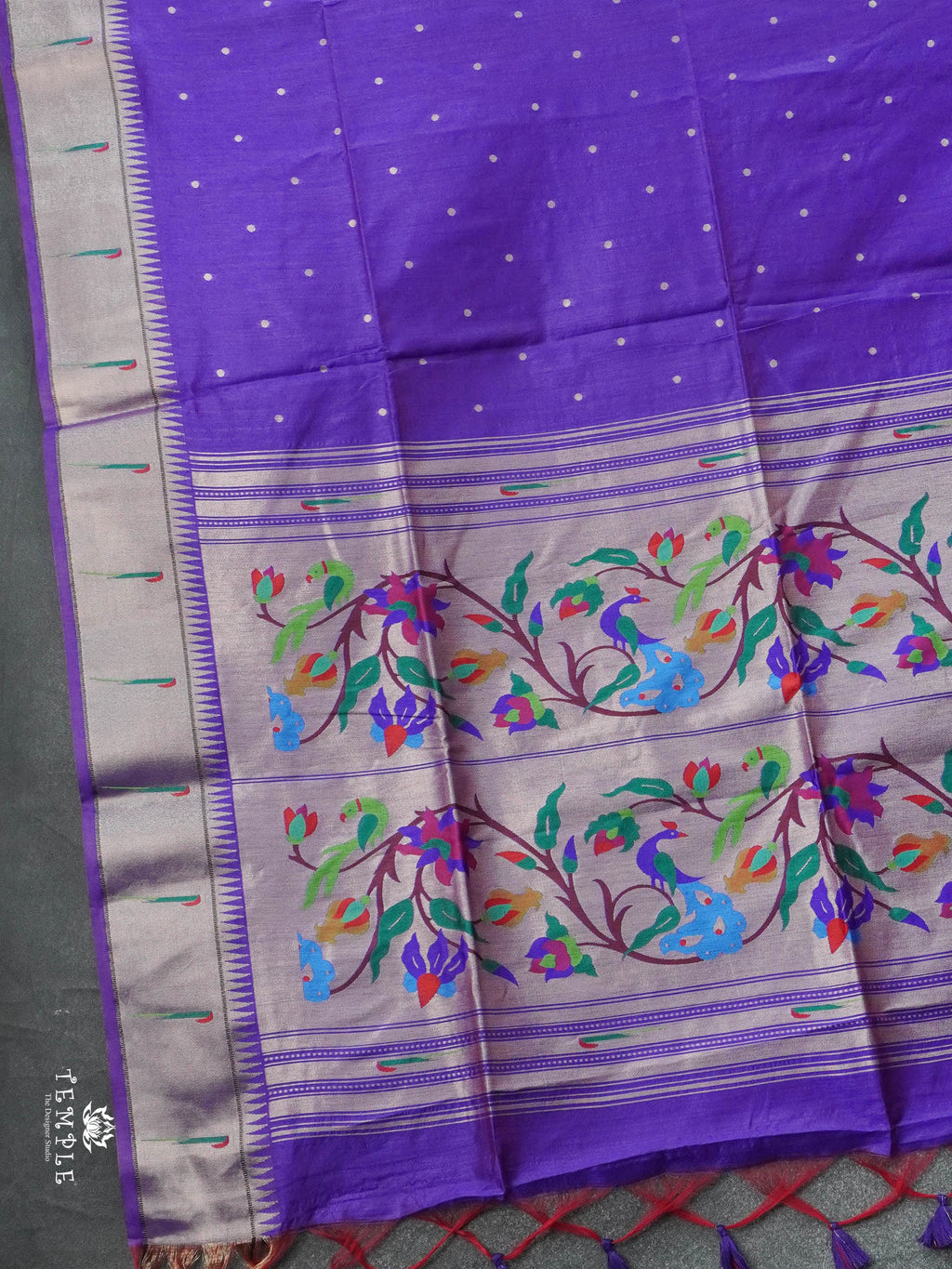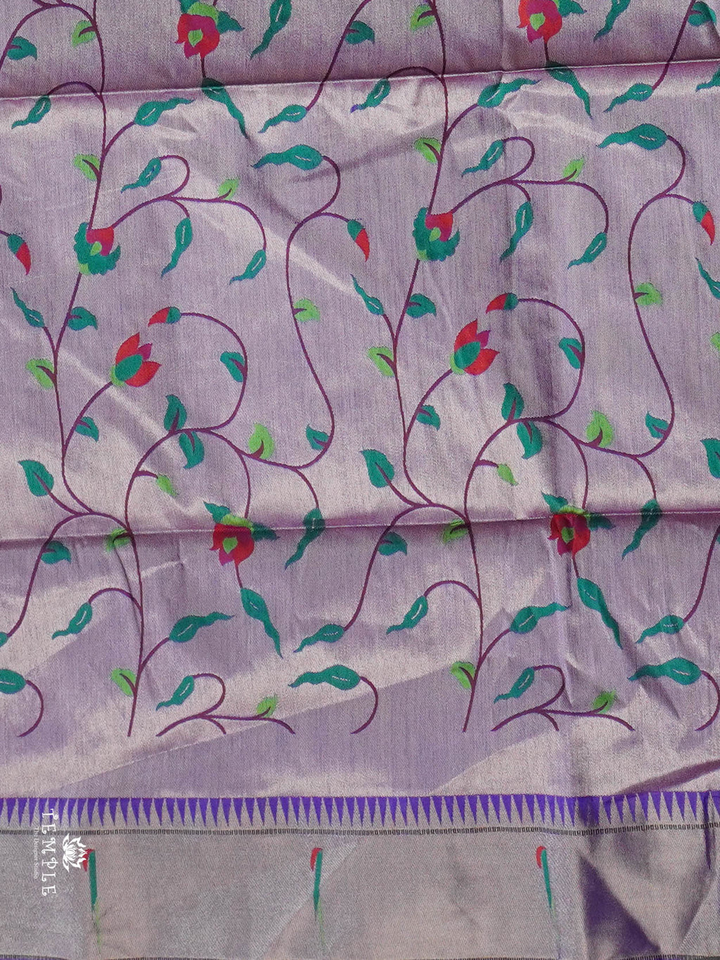Work - Adorned with delicate buttis and a beautifully detailed floral-peacock border in vibrant hues. Elegant, lightweight, and perfect for festive and traditional occasions.